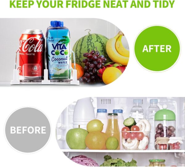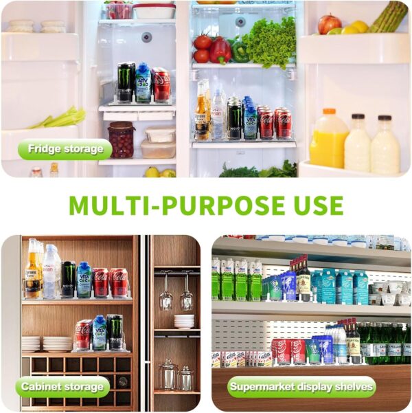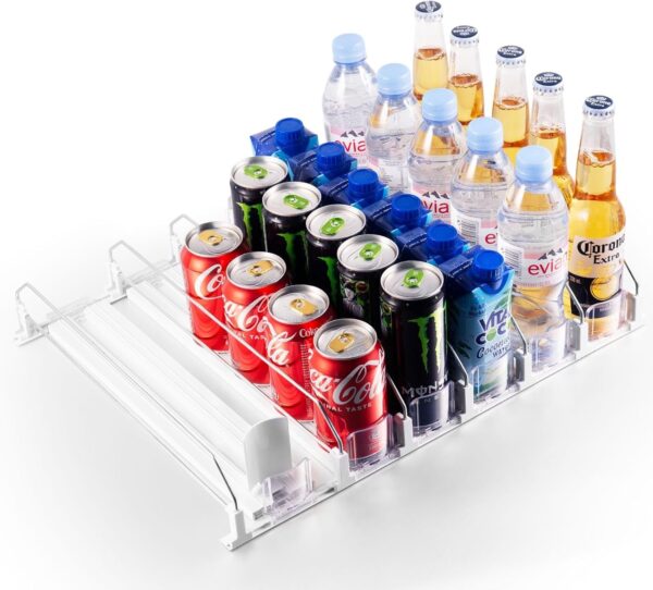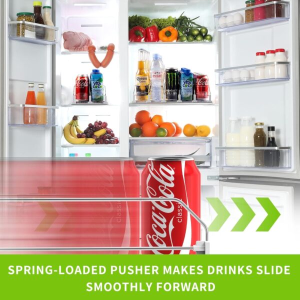 • [Diseño práctico] El organizador de latas de soda para refrigerador cuenta con un diseño de empujador de resorte integrado que desliza automáticamente y suavemente tu bebida hacia adelante. Esto garantiza que tu bebida siempre se muestre de manera destacada para un fácil acceso